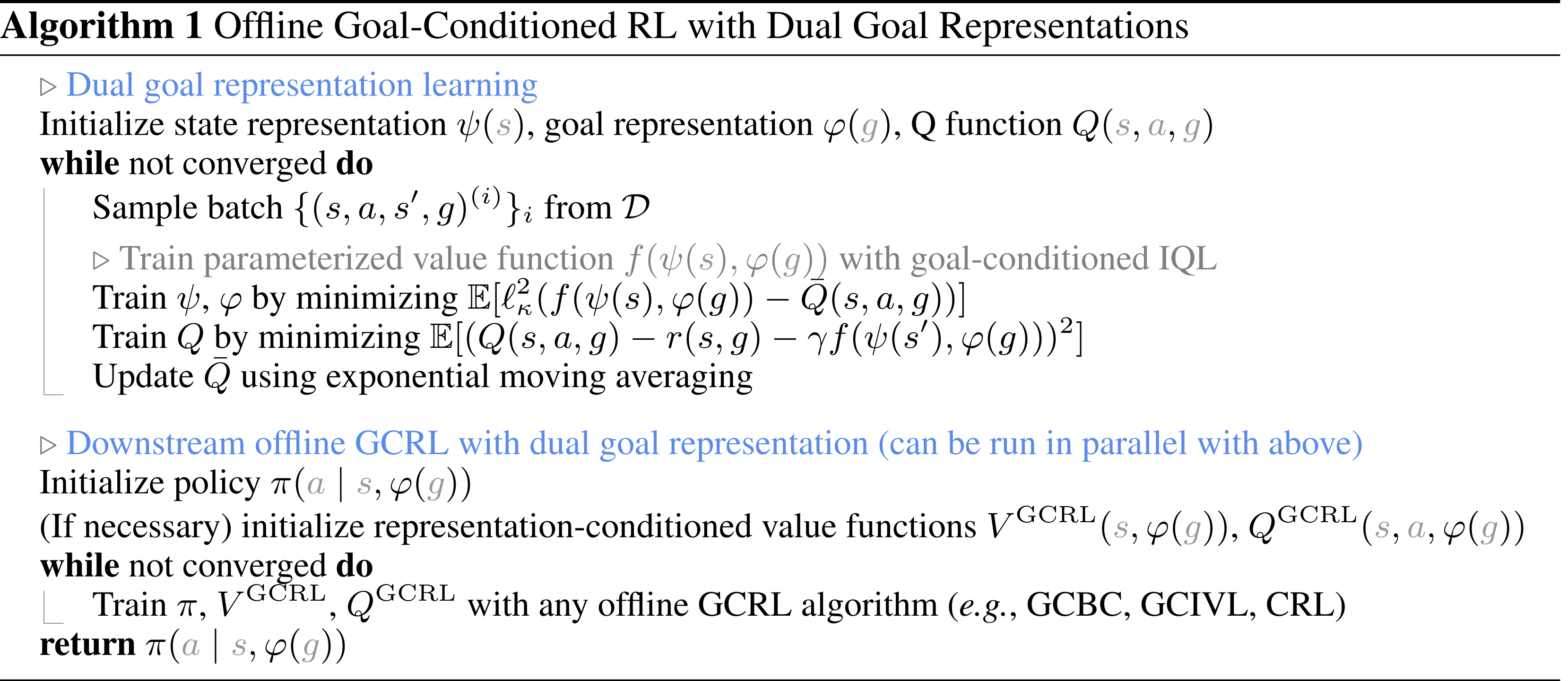In this post, I introduced the idea of dual representations for RL. This post is based on our recent work, Dual Goal Representations, co-led by Deepinder and myself. Personally, this was a slightly unusual research journey for me. I usually prefer "problem-driven" research, where I first set an empirical, quantifiable goal and then try to come up with a solution to achieve that goal. But this time, it started from a rather mathematically motivated idea, which turned out to have some nice properties and practical benefits. It was an enjoyable journey, and I hope that the concept of dual representations is useful and inspiring for future research in RL and machine learning!