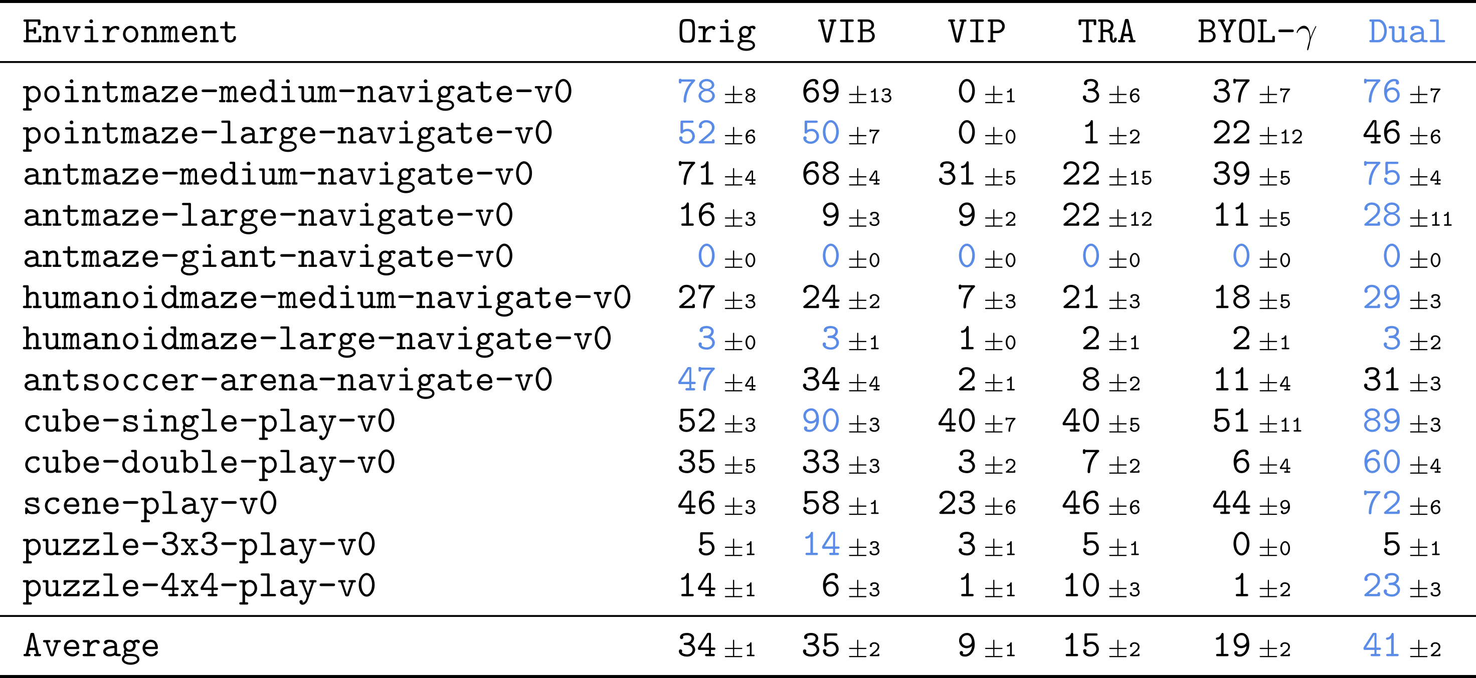 Here are the main results. The table shows that dual representations indeed improve goal-reaching performance. They often outperform previous representation learning methods as well. It's quite exciting to see that just changing a goal representation can lead to up to around \(2\times\) performance gains on some tasks!