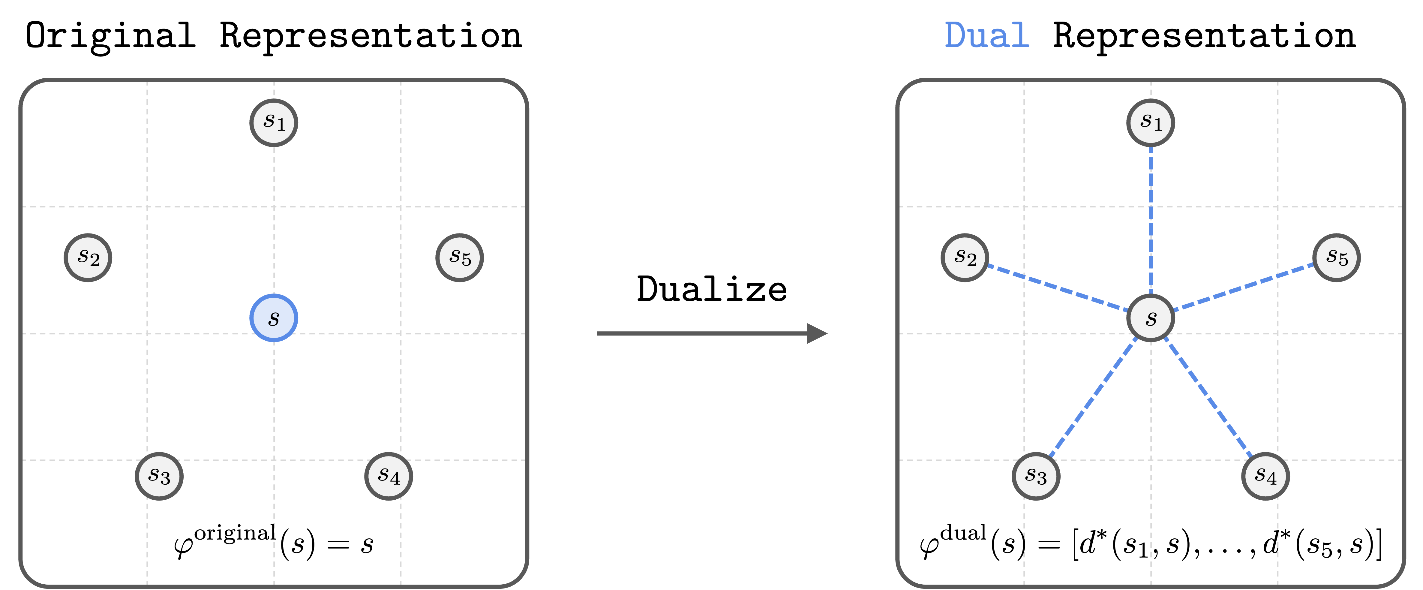 - First, dual representations are purely intrinsic. No matter how a state is originally represented (e.g., joint angles, pixels, etc.), its dual representation depends only on the temporal dynamics of the environment, providing a canonical way of representing states.